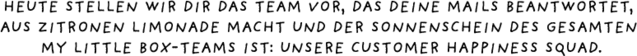 Eine Box, die deine Adresse partout nicht findet? Ein Produkt, das einfach so abgehauen ist? Oder willst du vielleicht einfach nur Danke sagen? Schreib eine E-mail an die Leute, die aus Zitronen Limonade zaubern – unser Customer-Happiness-Team!